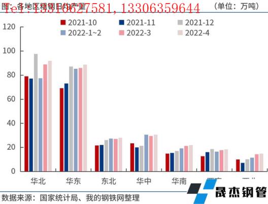 2022年4月份,華北、華東、東北、華中、華南、西南、西北等地區(qū)粗鋼日均產(chǎn)量91.9萬噸、88.8萬噸、28.0萬噸、30.5萬噸、22.0萬噸、18.3萬噸和14.8萬噸,分別較3月份增加3.0萬噸、2.9萬噸、0.9萬噸、1.0萬噸、0.7萬噸、0.6萬噸和0.5萬噸。