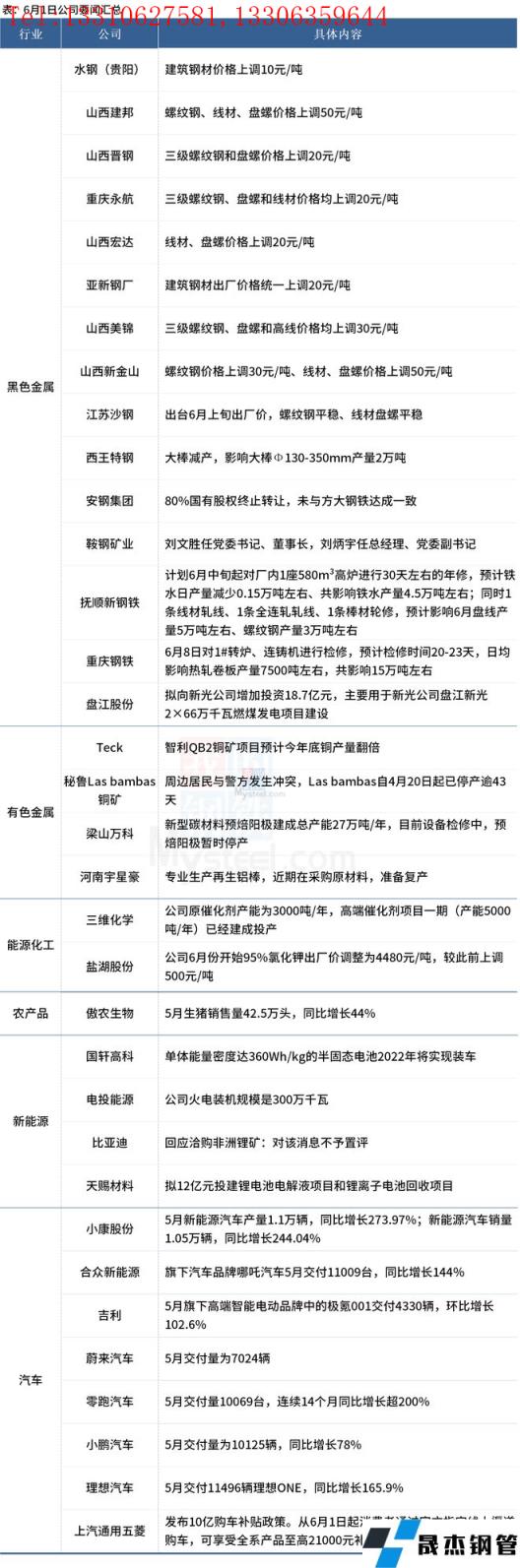 西王特鋼大棒減產,影響大棒Φ130-350mm產量2萬噸;江蘇沙鋼出臺6月上旬出廠價,螺紋鋼平穩、線材盤螺平穩;Teck智利QB2銅礦項目預計今年底銅產量翻倍;天賜材料擬12億元投建鋰電池電解液項目和鋰離子電池回收項目。