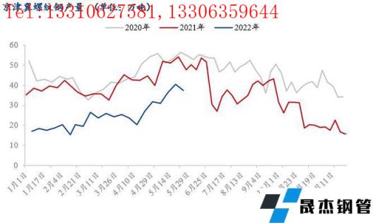 從上圖可以看出,5月份京津冀建筑厚壁無縫鋼管無縫厚壁鋼管廠家的螺紋鋼產(chǎn)量緩慢提升,雖然中下旬產(chǎn)量有所下降,但是仍處于相對(duì)高位,不過低于往年同期水平。截至5月底,螺紋鋼周產(chǎn)量為37.51萬噸,產(chǎn)量月環(huán)比提升17.6%,較去年同期低21.3%。本月除承鋼受當(dāng)?shù)匾咔橛绊懀线\(yùn)輸受阻,高爐有檢修情況,導(dǎo)致建材產(chǎn)量有所下降外,其他無縫厚壁鋼管廠家如敬業(yè)、東華、東海特鋼、樂鋼等月產(chǎn)量均有所提升,且隨著運(yùn)輸情況緩解,無縫厚壁鋼管廠家廠內(nèi)資源陸續(xù)向周邊市場分流。從調(diào)研情況來看,當(dāng)前無縫厚壁鋼管廠家螺紋鋼生產(chǎn)成本在4500-4600元/噸,雖然利潤微薄,但是6月份也無檢修計(jì)劃,且產(chǎn)量或較5月份有提升。