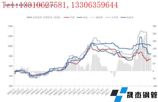 從2月至今我國收到的詢單以及實際出口成單情況來看,目前我國厚壁無縫鋼管進出口主要的驅動因素還是價差。在烏俄沖突爆發后,海外市場供需錯配的情況十分嚴峻,我國接收到的詢單以及已經簽訂的出口訂單出現暴增。即使面臨高額的出口稅,海外買家針對初級半成品到岸出價已經大幅高過成品材。5月后,全球價格開始大幅回落,基本形成一個倒”V”的態勢,近期受全球一系列刺激措施以及通脹的情況下,全球熱卷價格已經開始逐步趨穩,但海內外價差并未出現擴大的趨勢,所以短期內我國厚壁無縫鋼管出口依舊承壓,訂單較為萎靡。