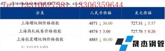 6月10日普鋼絕對(duì)價(jià)格指數(shù)變化:綜合指數(shù)5058.29,下跌12.4;螺紋鋼指數(shù)4821.36,下跌17.99;線材指數(shù)5213.65,下跌16.88;熱軋板卷指數(shù)4877.7,下跌9.63;冷軋板卷指數(shù)5337.5,下跌9.3;中厚板指數(shù)5076.26,下跌7.47。
