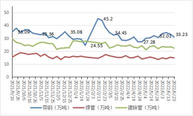 焊鍍管廠產(chǎn)能利用率靈活下降。6月在統(tǒng)計(jì)管廠總產(chǎn)量145.46萬噸,月比增產(chǎn)7.51萬噸,月中下旬產(chǎn)能利用率逐步下降至60%左右,周末倒班減產(chǎn),整體在統(tǒng)計(jì)管廠影響產(chǎn)量在14萬噸上下,占總產(chǎn)量的22.7%。截至6月23日,天津唐山邯鄲主流管廠廠內(nèi)總體庫存68.01萬噸,比上月增1.86萬噸。進(jìn)入6月,疫情形勢好轉(zhuǎn),主導(dǎo)管廠協(xié)議原料陸續(xù)到庫,但行情突降,生產(chǎn)利潤進(jìn)入洼地,管廠快速調(diào)整產(chǎn)能應(yīng)對,引導(dǎo)供需向再平衡過渡,整體來看,博弈階段仍存一定壓力(見圖4)。