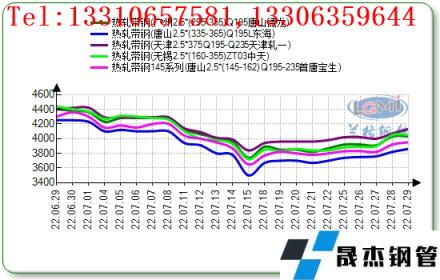 七月份國內帶鋼市場呈現震蕩下行趨勢。月初帶鋼市場價格整體趨弱運行,低價資源成交尚可,期貨市場寬幅震蕩,終端逢低補庫,高價成交疲軟。月中市場價格持續下行,整體成交偏弱,淡季效應顯現導致市場價格大幅走低,下游商貿情緒觀望為主。北方地區小窄帶方面,月末隨期貨震蕩走高,倒掛情況稍有緩解,為維持訂單及正常運轉,被動維持生產。7月帶鋼庫存持續小幅下降,無縫鋼管廠家產量也有所下降,需求端仍未得到改善。南方地區因疫情反復,加之目前正處于傳統淡季,商貿多以觀望為主,隨期貨盤整運行,市場商貿心態不穩,多以降庫為主,終端下游市場仍不景氣,觀望態度濃厚,實際需求延續偏弱,加之下游開工維持低位,帶鋼底部支撐不足。截止至7月29日,華北地區唐山小窄帶報價主流為3950元/噸,唐山355系窄帶鋼主流報價為3860元/噸,天津355系窄帶主流報價為4130元/噸,華東地區無錫355系窄帶主流報價為4050元/噸,華南地區廣州355系窄帶主流報價為4030元/噸。
