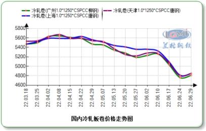 目前由于世界經(jīng)濟(jì)滯脹風(fēng)險(xiǎn)上升,全球加息大潮洶涌澎湃,外部不確定因素明顯增加,需求收縮與供給沖擊交織,結(jié)構(gòu)性矛盾和周期性問(wèn)題疊加,國(guó)內(nèi)經(jīng)濟(jì)持續(xù)恢復(fù)基礎(chǔ)不穩(wěn)固。7月份國(guó)內(nèi)正處于傳統(tǒng)季節(jié)性需求淡季,北方面臨高溫天氣,南方面臨雨季影響,對(duì)戶外施工項(xiàng)目產(chǎn)生明顯影響,導(dǎo)致整體厚壁鋼管需求恢復(fù)緩慢。后美聯(lián)儲(chǔ)宣布加息75個(gè)基點(diǎn),低于市場(chǎng)預(yù)期100個(gè)基點(diǎn),從而帶動(dòng)市場(chǎng)有所反彈,使得冷軋板卷市場(chǎng)呈現(xiàn)先跌后漲行情。